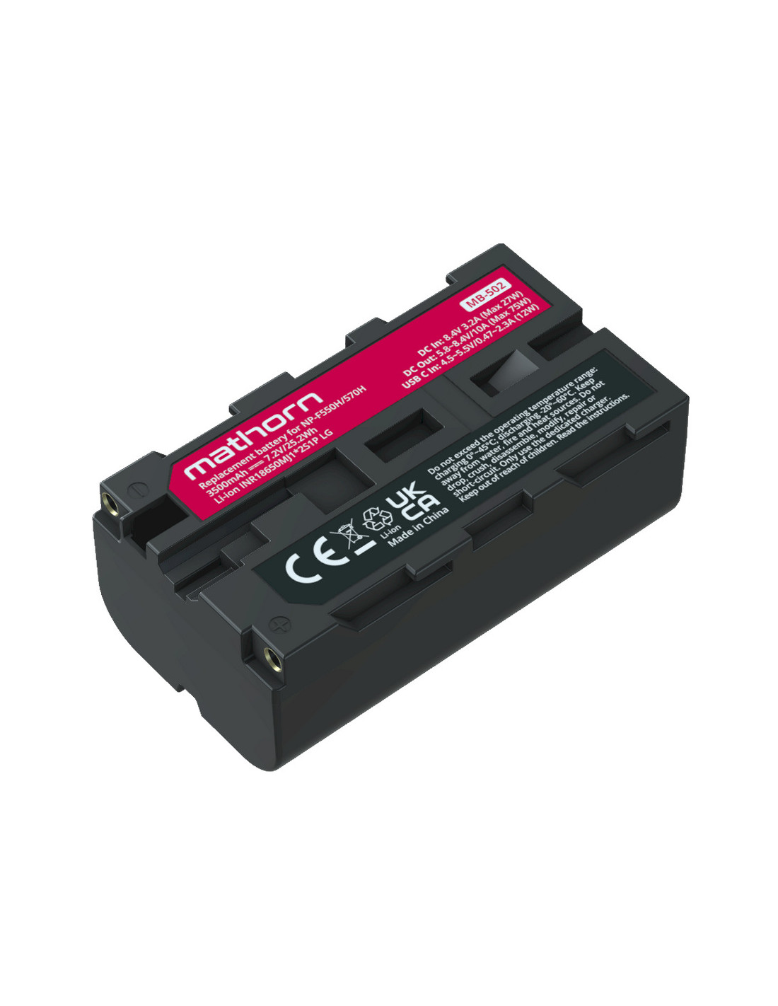 Mathorn MB-502 to w pełni kompatybilny zamiennik baterii Sony NP-F550H / NP-F570H. Konstrukcja baterii oparta jest na dwóch ogniwach LG INR18650MJ1 o łącznej pojemności 3500mAh i energii 25.2Wh. Dzięki niewielkim wymiarom i niskiej wadze MB-502 świetnie sprawdza się jako źródło zasilania dla lekkich akcesoriów foto-wideo. Jest odpowiednim wyborem do: