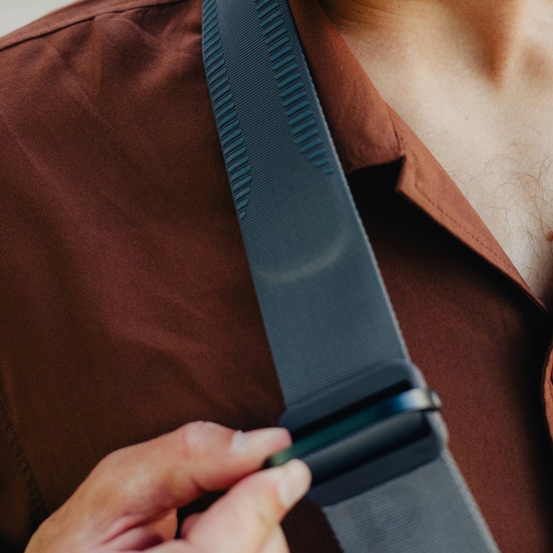 Slide możesz nosić na ramieniu, na szyi lub przez plecy. Silikonowe elementy na jednej stronie paska zapewniają, że nie zsuwa się on z ramienia, a gładka strona ułatwia przesuwanie paska po ubraniu, zapewniając wygodę przy noszeniu na szyi. Szybka regulacja długości za pomocą aluminiowych uchwytów umożliwia wygodne przełożenie paska przez ramię lub noszenie go jak torby typu Sling.