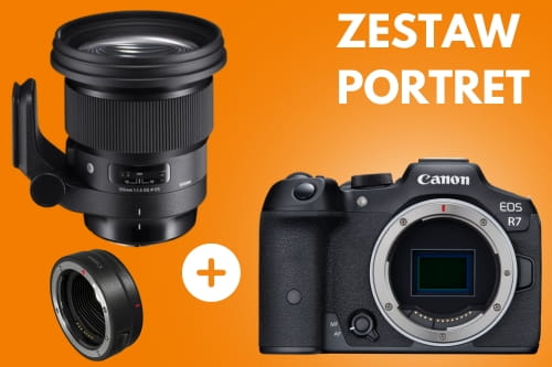 Zestaw zawiera aparat Canon EOS R7, obiektyw Sigma 105 mm f/1.4 A DG HSM oraz adapter Canon