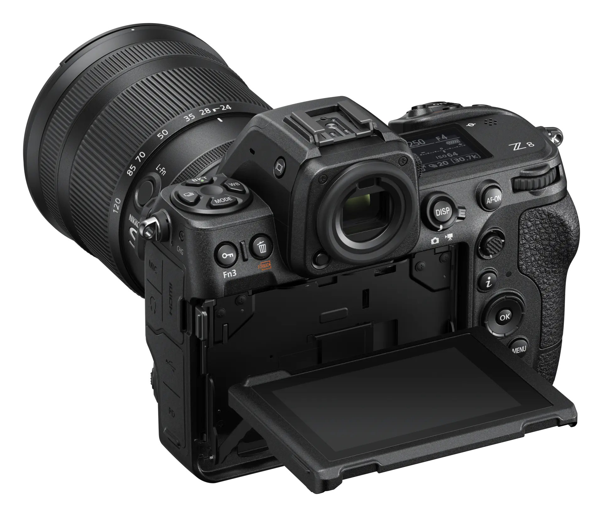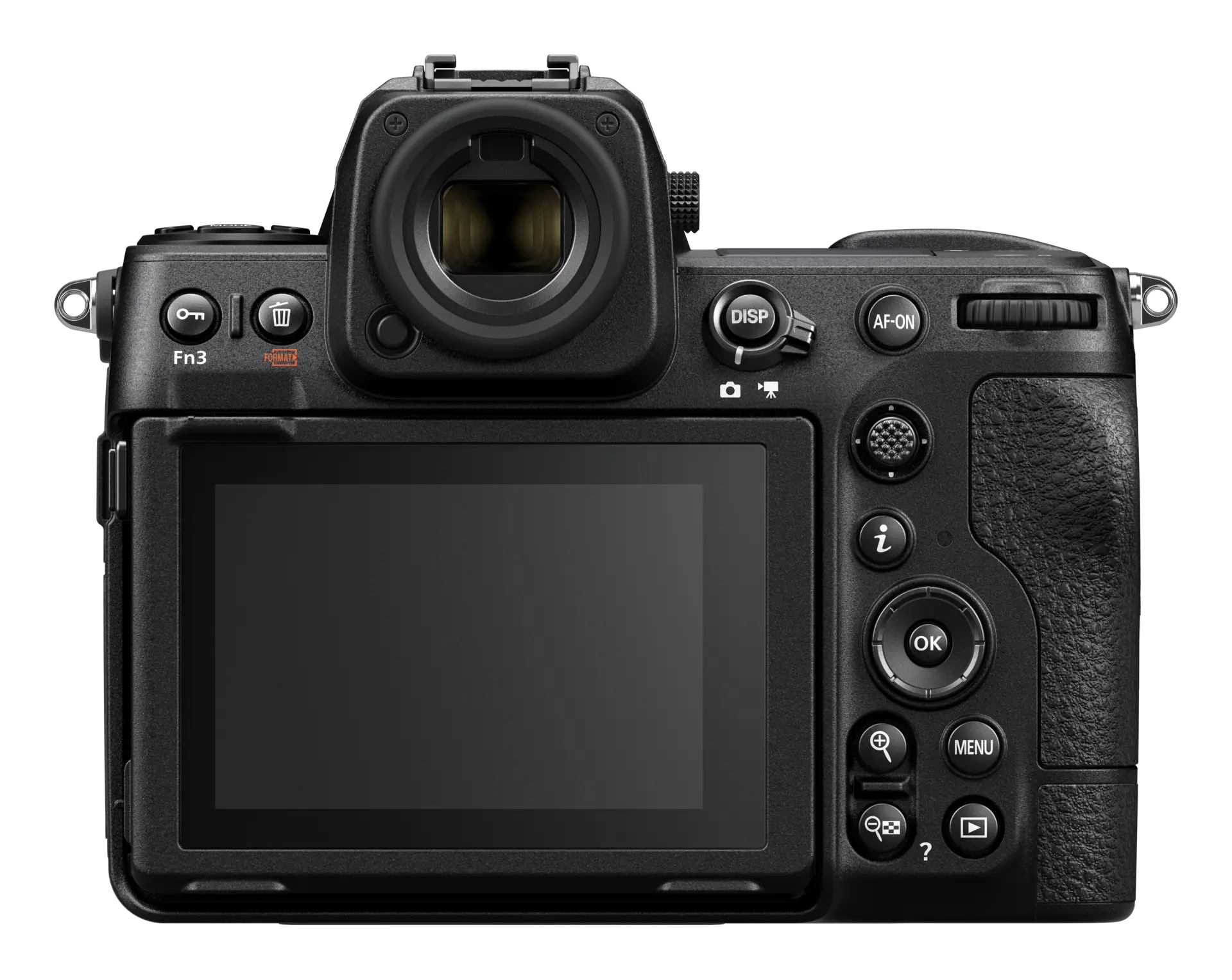 LCD: Główny: uchylny w 4 kierunkach, 3.2-calowy, kolorowy TFT LCD, 2100 tys. punktów, kąt widzenia 170 stopni, pokrycie 100% pola widzenia, w pełni dotykowy; Pomocniczy: podświetlany