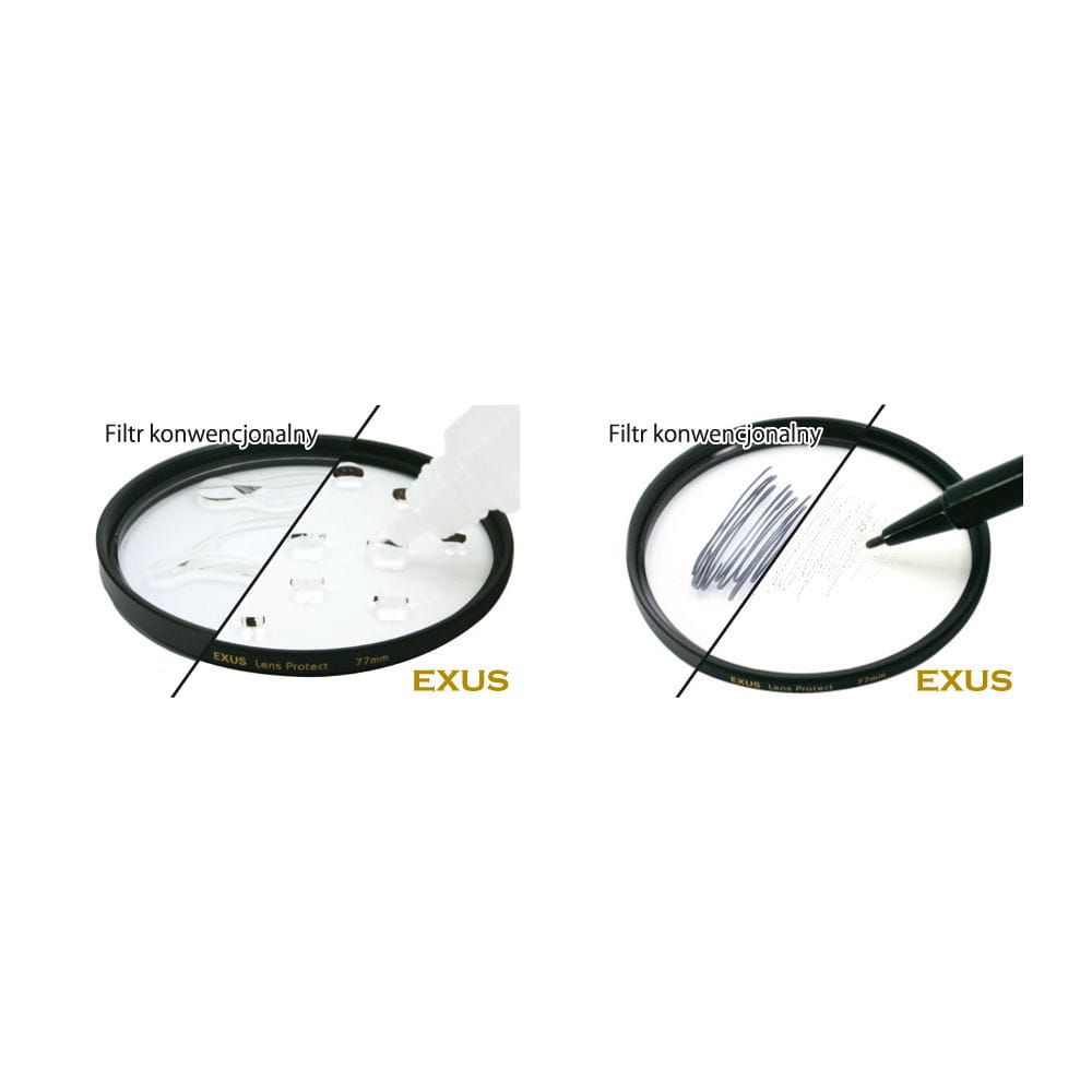 Wygasza niechciane refleksy i odbicia światła na wodzie, niebie, szkle i innych płaszczyznach niemetalicznych. Pogłębia błękit nieba i poprawia jego kontrast, zwiększa nasycenie kolorów. Filtr EXUS CPL posiada nowe powłoki, które charakteryzują się wyższą o 30% transmisją światła w stosunku do konwencjonalnych filtrów polaryzacyjnych. Szkło w filtrze serii EXUS charakteryzuje się wyczernionym brzegiem. Jest to zabezpieczenie przed blikami, które mogą powstać na strukturze szkła przy padaniu promieni światła pod ostrym kątem (z boku). Dodatkowe powłoki hydrofobowe sprawiają, że woda nagromadzona na powierzchni nie tworzy plam, lecz łatwe do usunięcia krople, a zastosowanie nowej powłoki ASC (Anti-static Coating) sprawia, że brud i kurz nie osadza się na powierzchni filtra. Filtr EXUS UV to najwyższa jakość w 60-letniej historii producenta. Wykonany jest ze szkła, które jest o 2 mm grubsze od konwencjonalnych co przekłada się na większą odporność na uszkodzenia mechaniczne. Jednocześnie oprawiony jest w cienki pierścień typu SLIM (wide) dzięki czemu zdjęcia wykonane obiektywami ultra-szerokokątnymi nie są narażone na uboczny efekt winietowania. Matowe (satynowe) wykończenie oprawki dodatkowo zabezpiecza przed powstaniem niepożądanych odbić lub blików.
