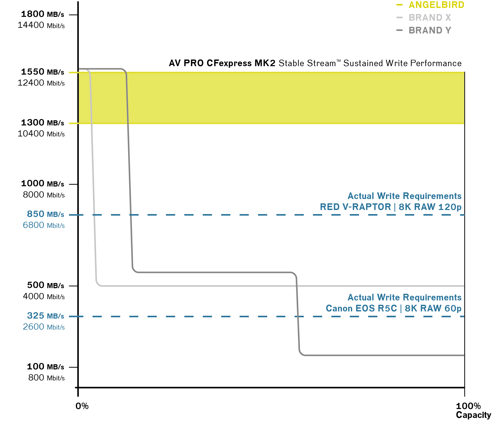 Karty Angelbird AV PRO Cfexpress MK2 charakteryzują się największą możliwą pojemnością będącą w stanie rejestrować zapis z kamer i aparatów o rozdzielczości nawet 12K w formacie RAW. Producent zapewnia o stałej minimalnej prędkości zapisu na poziomie 1300 MB/s na całej dostępnej pojemności karty. Dzieje się tak dzięki technologii Stable Stream™ która również ma wpływ na płynność rejestrowanego obrazu oraz zapewnia brak pominiętych klatek. Maksymalna prędkość zapisu kart Angelbird AV PRO Cfexpress MK2 wynosi 1550 MB/s. Parametr zapisu jakim charakteryzują się nowe karty przewyższa możliwości obecnie dostępnych kamer i aparatów.