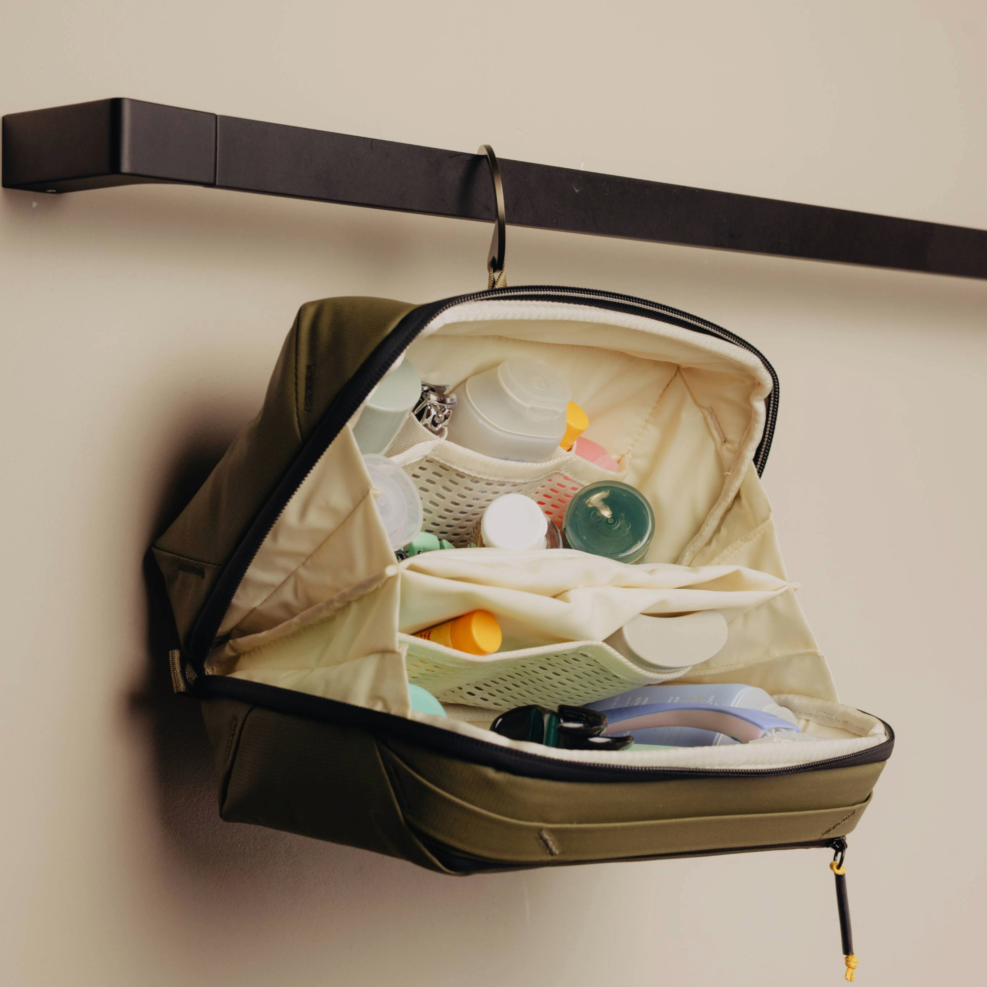 Wash Pouch posiada również poręczny uchwyt, który umożliwia zawieszenie pokrowca w pozycji otwartej lub zamkniętej. To proste rozwiązanie zwiększa wygodę użytkowania i pozwala na łatwiejszy dostęp do zawartości, zarówno w hotelu, jak i podczas podróży.