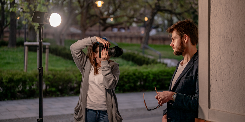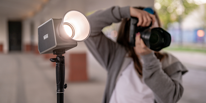 kompaktowa lampa LED o mocy 100 W, stworzona z myślą o twórcach, którzy cenią mobilność i wysoką jakość światła. Oferuje regulację temperatury barwowej w zakresie od 2700 do 6500 K, wysoki współczynnik CRI (≥97), 12 efektów specjalnych i aż 20100 lx maks. natężenia światła. Wbudowany akumulator 4500 mAh zapewnia niezależność od gniazdka, a aplikacja mobilna pozwala sterować urządzeniem zdalnie (do 60 m). Lampa oferuje mocowanie mini Bowens, a po dokupieniu adaptera, wspiera także pełnowymiarowe akcesoria w standardzie Bowens. Dzięki wysokiej jasności światła i płynnej regulacji parametrów świetnie sprawdzi się w rękach fotografów, filmowców i twórców contentu – zarówno w plenerze, jak i w studiu.