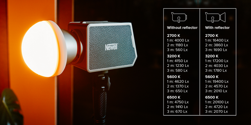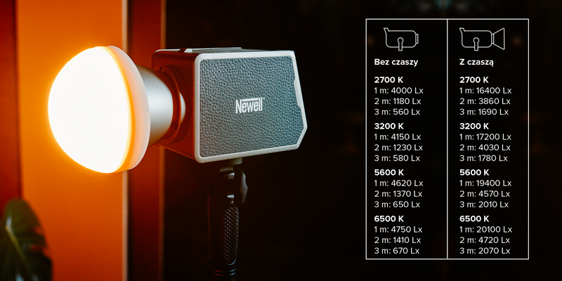 Newell Zora 90 WB, mimo kompaktowych rozmiarów, oferuje natężenie światła, które z pewnością Cię zaskoczy. Dzięki wydajnym diodom LED lampa osiąga nawet 20100 luksów z odległości 1 metra od obiektu (przy 6500 K i z dołączoną czaszą). Dzięki temu oświetlisz nie tylko twarz w kadrze, ale i całe pomieszczenie, w którym nagrywasz vloga. Precyzyjnie skalibrowany strumień światła, płynna regulacja i wysoka stabilność sprawiają, że możesz używać lampy Zora 90 WB zarówno jako światła głównego, jak i efektowego – z pełną kontrolą nad tym, jak wygląda Twoja scena.