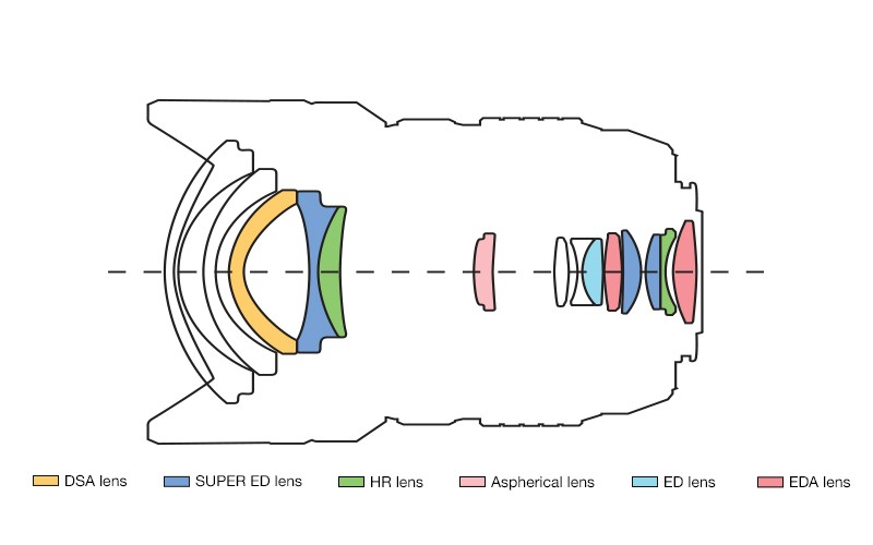 Konstrukcja optyczna obiektywu zbudowana została z 14 soczewek, które ułożono w 11 grupach. Wśród nich można wyróżnić specjalne elementy optyczne - 1 soczewkę DSA, 3 soczewki Super ED, 2 soczewki HR, charakteryzujące się wysokim współczynnikiem refrakcji, 1 soczewkę asferyczną, 1 soczewkę ED, wykonaną ze szkła o niskiej dyspersji, oraz 2 soczewki EDA. Tak zaprojektowany układ optyczny odpowiedzialny jest za korygowanie wszelkich aberracji, co w efekcie pozwala uzyskać doskonały obraz pozbawiony zniekształceń, cechujący się wyjątkową ostrością w całej rozpiętości kadru.