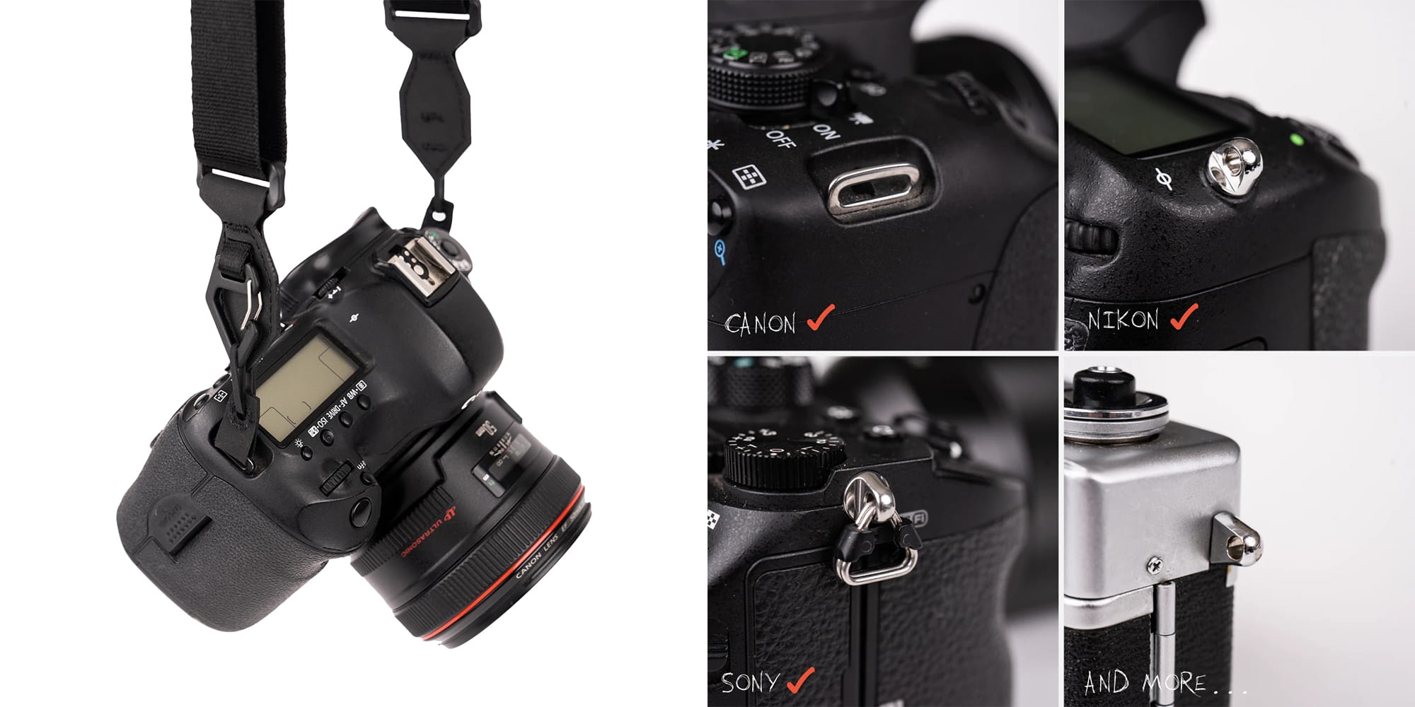 Dwa niezależne punkty regulacji długości paska dają ogromną swobodę i zapewniają komfort pracy niezależnie od tego, czy spacerujesz przez miasto, czy zdobywasz kolejny górski szczyt. Uniwersalny system mocowania pozwoli połączyć go z niemal każdym aparatem dostępnym na rynku. Dzięki zastosowaniu wytrzymałych materiałów, prostej instalacji, ukrytemu narzędziu do odkręcania płytek montażowych i silikonowym antypoślizgowym wstawkom już nigdy nie wrócisz do swojego starego paska, który dołączono do Twojego kompaktu lub lustrzanki!