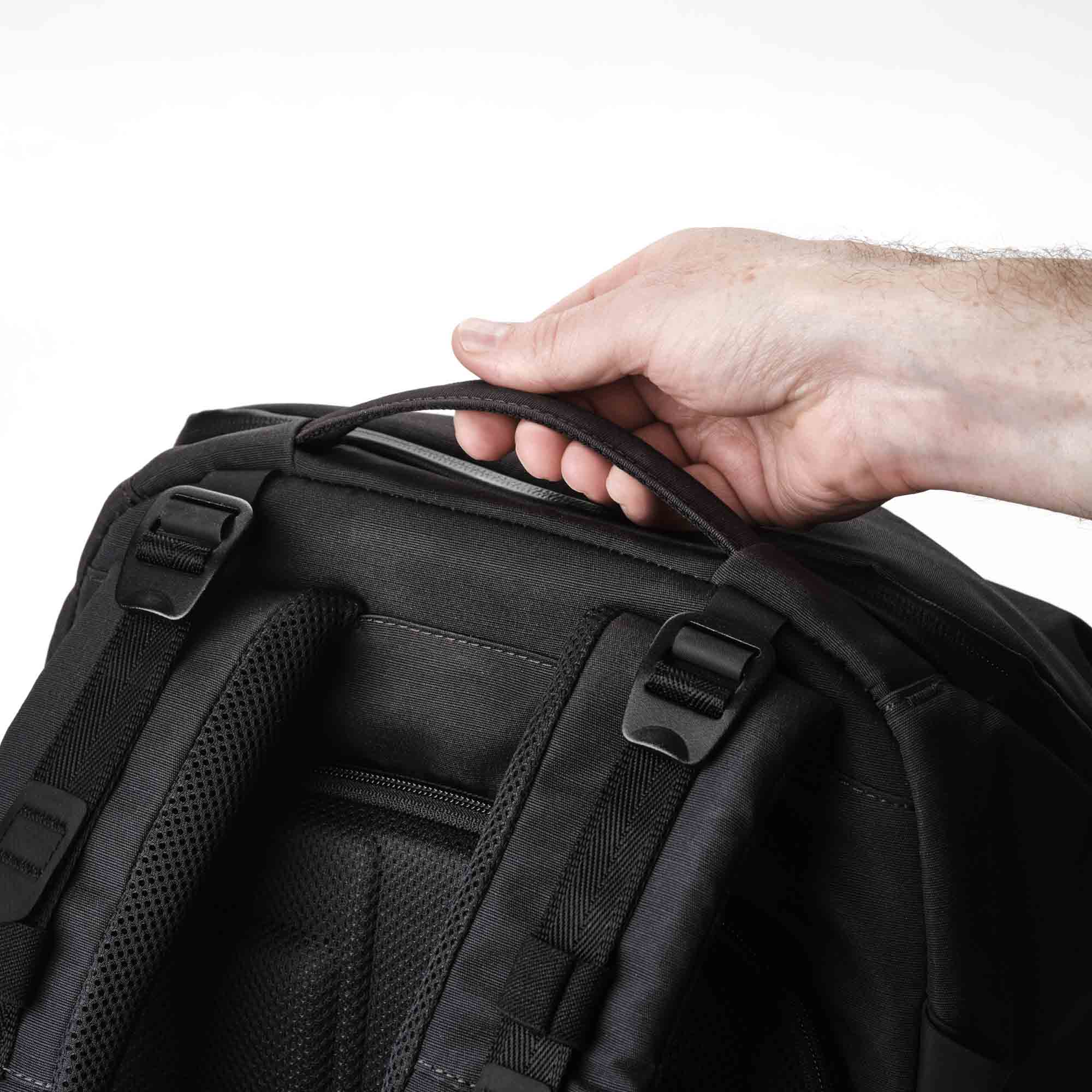 Wygodny uchwyt górny: Automatycznie chowa się, aby nie przeszkadzać podczas noszenia plecaka.