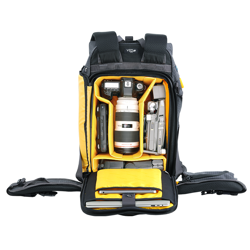 Dodatkowo, spakowany w samoistny, zabezpieczający sprzęt fotograficzny kontener może być w całości szybko wyjęty przekształcając plecak w bagaż o większej ładowności. 25-litrowej pojemności plecak VEO ACTIVE 46 oferuje także dedykowane kieszenie na 14” laptop oraz 10” tablet. Dzięki zintegrowanemu interfejsowi USB możesz teraz ładować aparat lub smartfon w trakcie jego użytkowania, będąc z plecakiem na plecach w podróży. Za zewnętrzne zabezpieczenie sprzętu odpowiada innowacyjne połączenie nylonu 840D typu ripstop z podwójnym laminatem PU, które zapewnia solidną odporność na ścieranie i rozdarcie oraz odporność na warunki atmosferyczne.