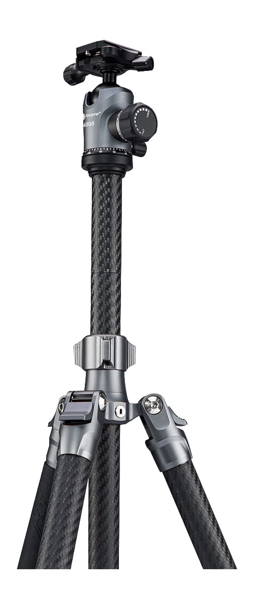 Głowica kulowa Fotopro 62QS, która wieńczy statyw, świetnie sprawdzi się zarówno w przypadku dynamicznych kadrów, jak i podczas fotografowania statycznych krajobrazów oraz portretów. Wyposażono ją w dwa niezależne i wygodne w użyciu pokrętła. Jedno z nich pozwala płynnie regulować siłę zacisku blokującego kulę podczas pochylania. Drugie pokrętło kontroluje ruch obrotowej podstawy głowicy. Naniesiono na nią skalę 360°, która ułatwi precyzyjne panoramowanie. Głowica jest kompatybilna z płytkami szybkiego montażu wykonanymi w popularnym standardzie Arca-Swiss. Dwie poziomnice pozwolą idealnie ustawić aparat i uzyskać perfekcyjne kadry w każdych warunkach terenowych!