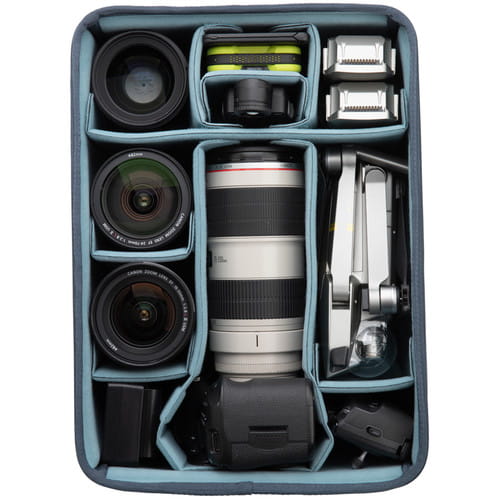 Duży wkład w kolorze paryskiej nocy od Shimoda Designs jest częścią serii wkładów, która zwiększa możliwość uporządkowania zawartości plecaka Shimoda Designs. Zaprojektowany do przechowywania aparatów fotograficznych, wideo, audio lub cyfrowych mediów, może pomieścić do dwóch aparatów i dziewięciu obiektywów, w tym 70-200 mm f / 2.8