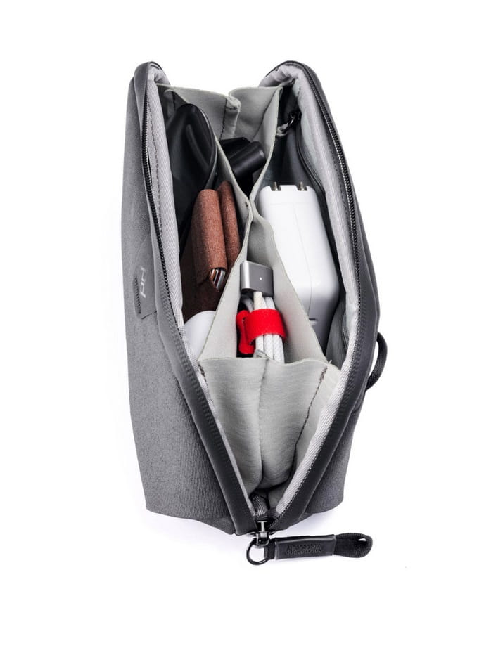 Tech Pouch został wyposażony w cały szereg elastycznych, rozciąganych kieszeni oraz kieszeni typu origami. Takie rozwiązanie pozwala zachować kompaktowe rozmiary pokrowca jeśli zawartość nie wypełnia całości. Możliwe jest też dopasowanie wielkości kieszenie do wkładanego przedmiotu.