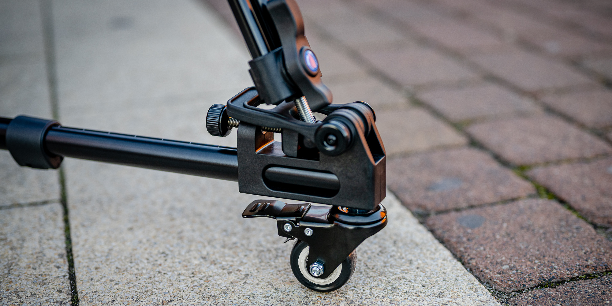 Wózek do statywu Fotopro Fire Wheels wyposażono w wysokiej jakości kółka pokryte wytrzymałą, gumową powłoką. Zainstalowano je w taki sposób, aby urządzenie można było wygodnie obracać i bez wysiłku pchać w dowolnym kierunku. Nie musisz przy tym zdejmować statywu z wózka, aby wykonywać statyczne ujęcia. Każde kółko wyposażono w specjalną blokadę, którą możesz wcisnąć za pomocą stopy, w celu całkowitego unieruchomienia wózka.